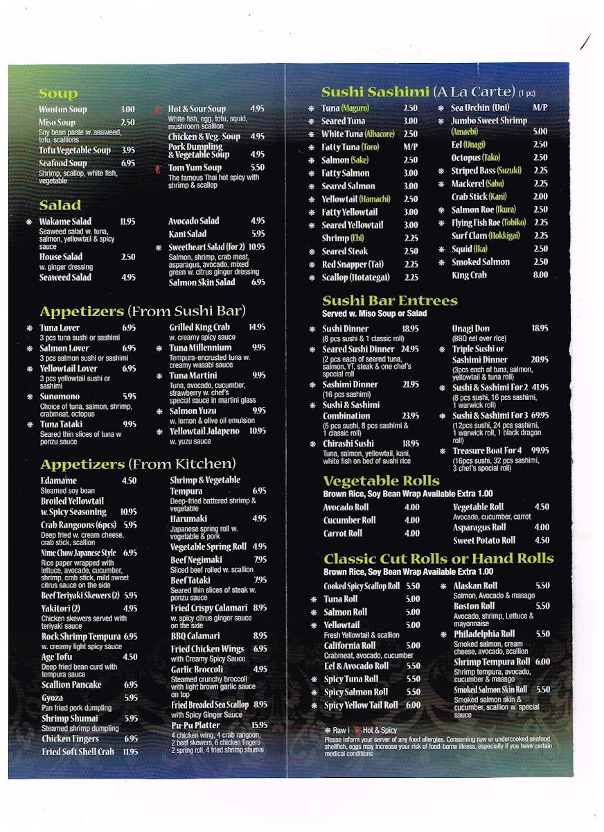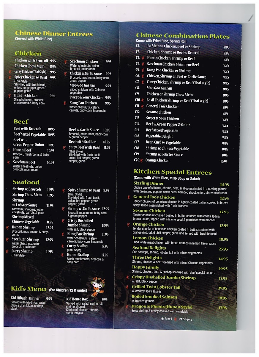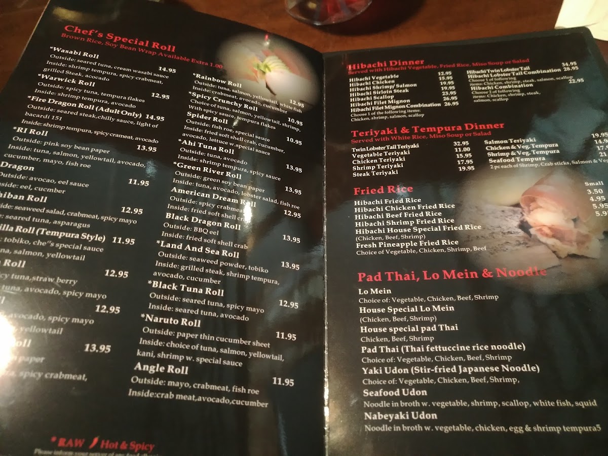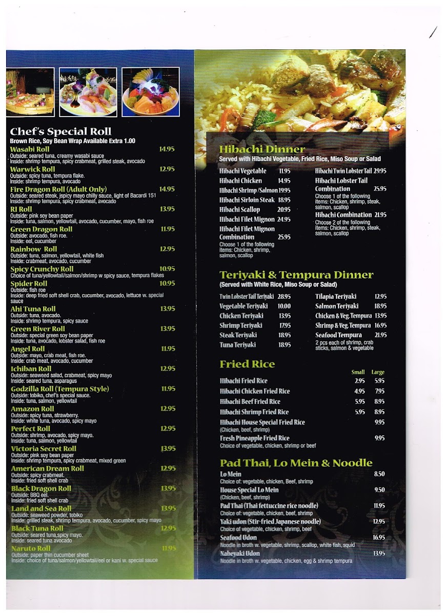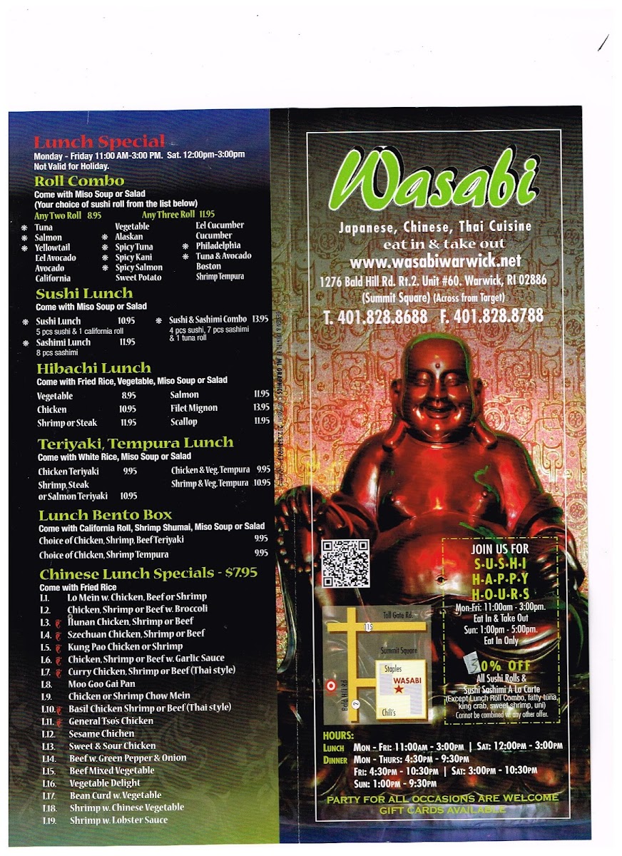 Welcome to Wasabi Japanese Chinese Thai Cuisine, a delightful culinary destination located in Warwick, RI. This vibrant restaurant offers an extensive menu that marries Japanese, Chinese, and Thai flavors, creating a unique dining experience. One of the highlights is their Hibachi Dinner, featuring options like the succulent Hibachi Filet Mignon Combination and the fresh Hibachi Shrimp, prepared right before your eyes, adding an interactive flair to your meal.